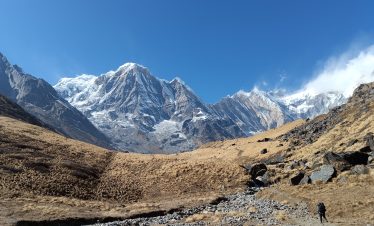 The trek follows the famous Annapurna Base Camp trail, passing through terraced farmlands, rhododendron forests, Gurung and Magar villages, and alpine landscapes. After reaching Annapurna Base Camp (4,130 m), instead of trekking back the same route, guests enjoy a helicopter flight back to Pokhara or Kathmandu.